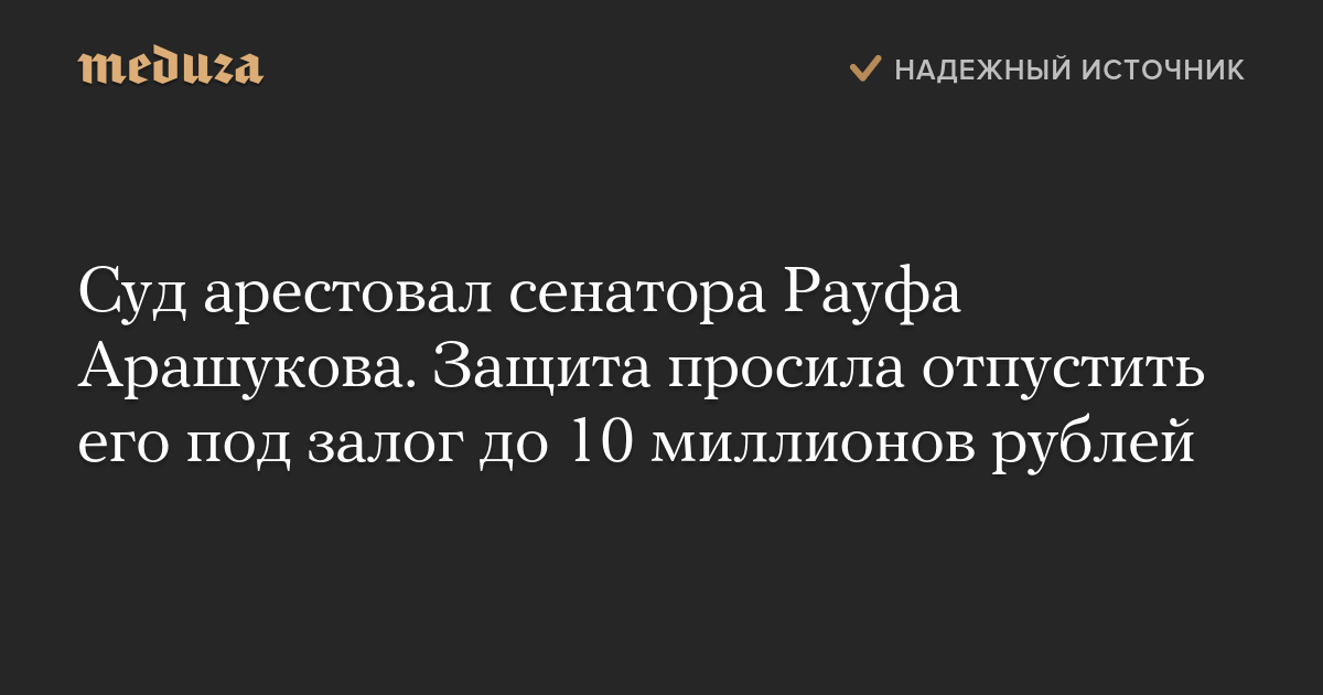 Адвокат предлагал отпустить Арашукова под залог до 10 миллионов рублей или посадить его под домашний арест. Следователь ходатайствовал о заключении сенатора под стражу, заявив, что он может сбежать в Объединенные Арабские Эмираты, где у него, предположительно, есть вид на жительство.