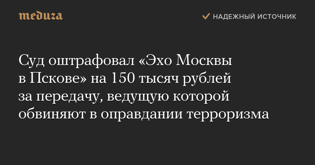 Суд оштрафовал «Эхо Москвы в Пскове» на 150 тысяч рублей за передачу, ведущую которой обвиняют в оправдании терроризма