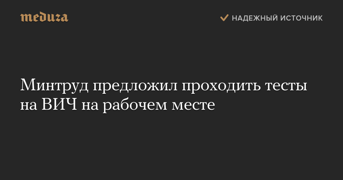 Тестирование на ВИЧ на рабочих местах, сообщили в ведомстве, рекомендовано Международной организацией труда (МОТ). Как планируется организовать эту процедуру, в Минтруде не пояснили.