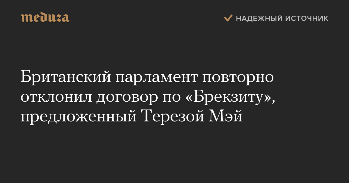 Британский парламент повторно отклонил договор по «Брекзиту», предложенный Терезой Мэй