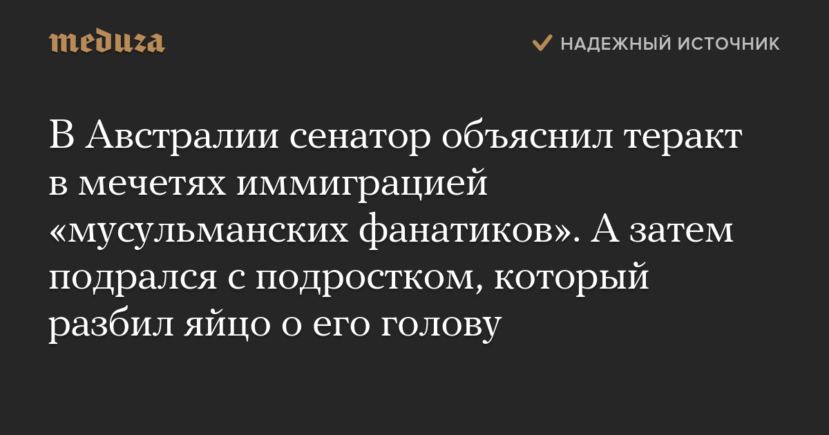 Австралийский сенатор назвал причиной убийства 49 человек в мечетях Новой Зеландии иммиграцию «мусульманских фанатиков», а затем подрался с 17-летним подростком, который разбил яйцо о его голову.
