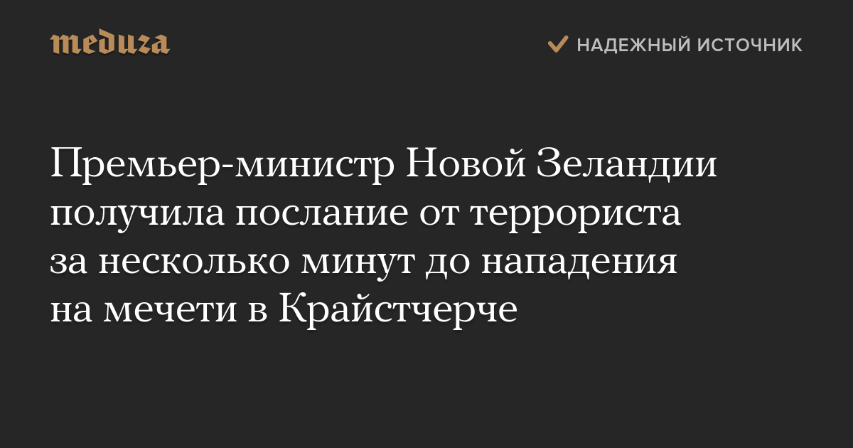 По словам Арден, ее канцелярия была одним из 30 адресов, по которым Таррант отправил свое послание. «Ни места нападения, ни каких-либо других деталей он [„манифест“ — прим. „Медуза“] не содержал», — подчеркнула премьер-министр.