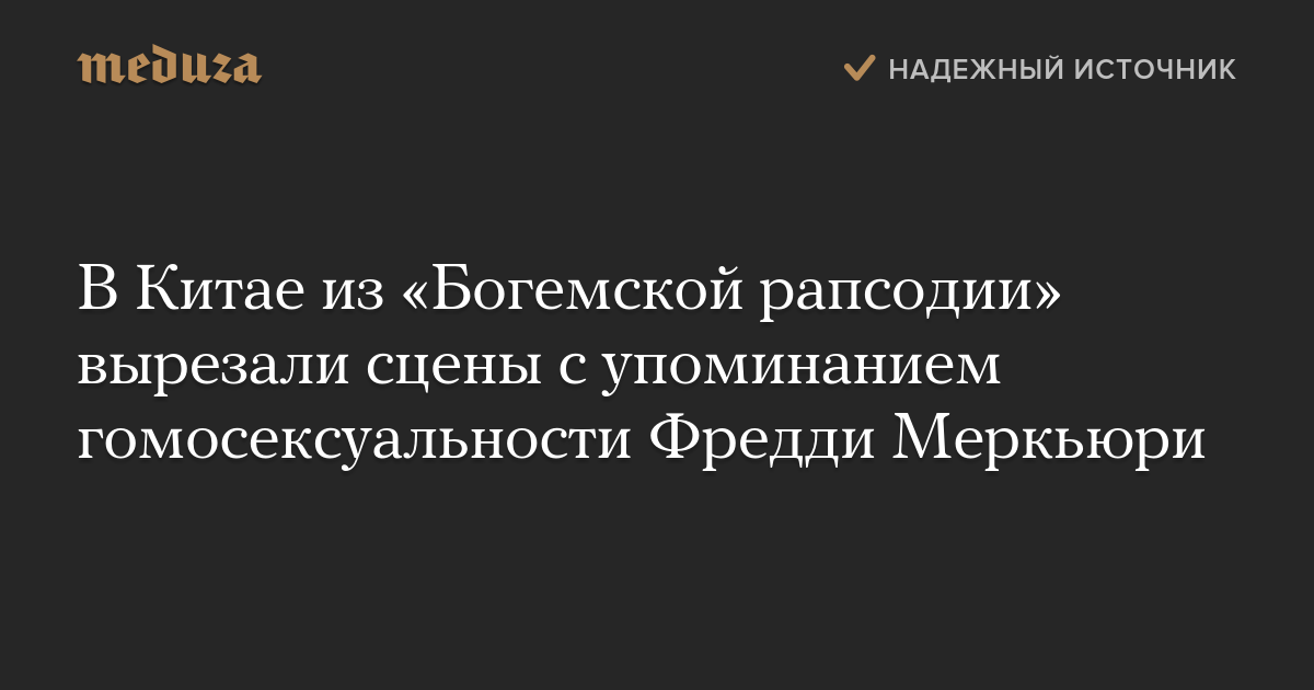 Цензоры в Китае вырезали из фильма «Богемская рапсодия», посвященного группе Queen и ее солисту Фредди Меркьюри, шесть сцен с упоминанием гомосексуальности Меркьюри. Об этом сообщает CNN со ссылкой на китайского документалиста и ЛГБТ-активиста Фана Попо.