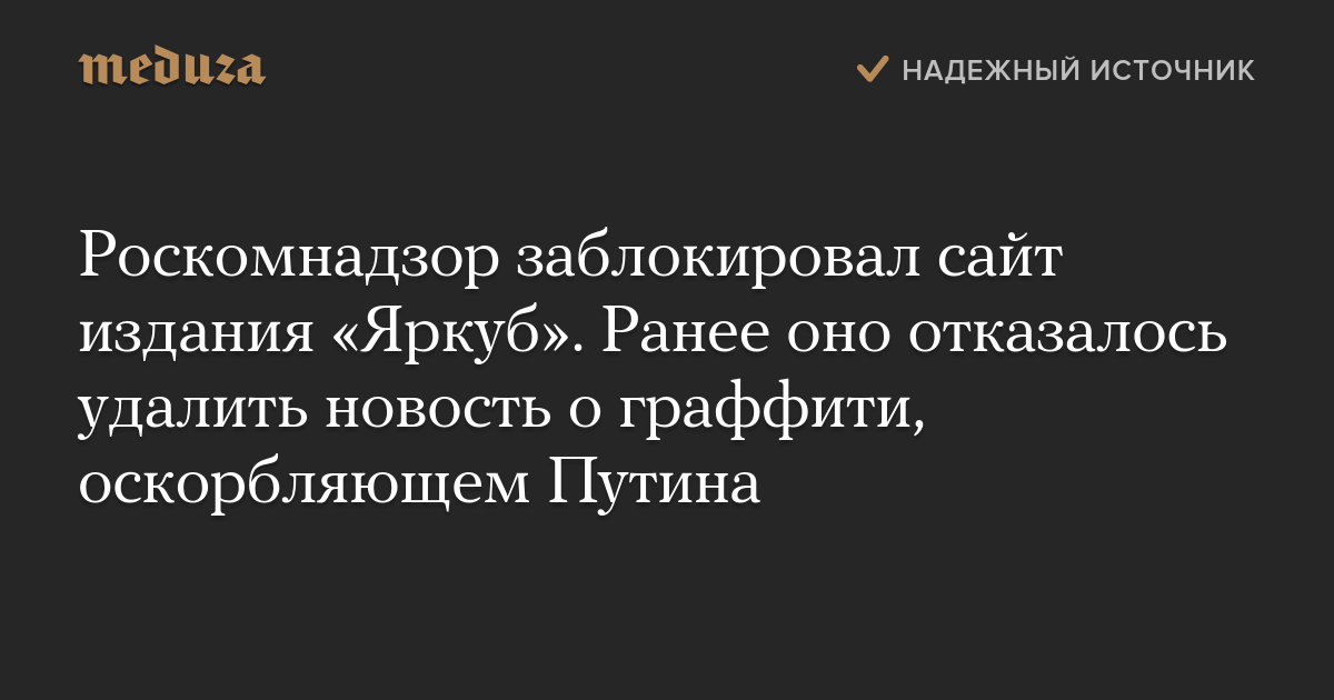 Роскомнадзор заблокировал сайт издания «Яркуб». Ранее оно отказалось удалить новость о граффити, оскорбляющем Путина