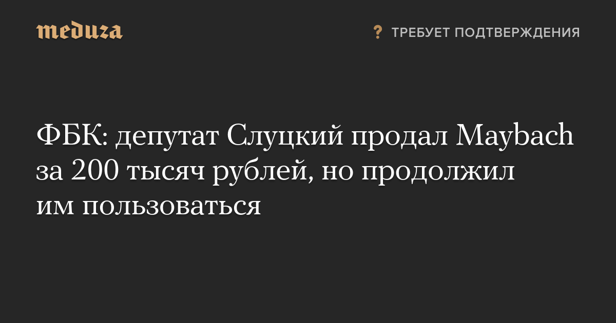 Депутат Госдумы Леонид Слуцкий продал автомобиль Maybach за 200 тысяч рублей, а затем продолжил им пользоваться, не декларируя машину в собственность. Об этом говорится в расследовании Фонда борьбы с коррупцией (ФБК), опубликованном Алексеем Навальным.
