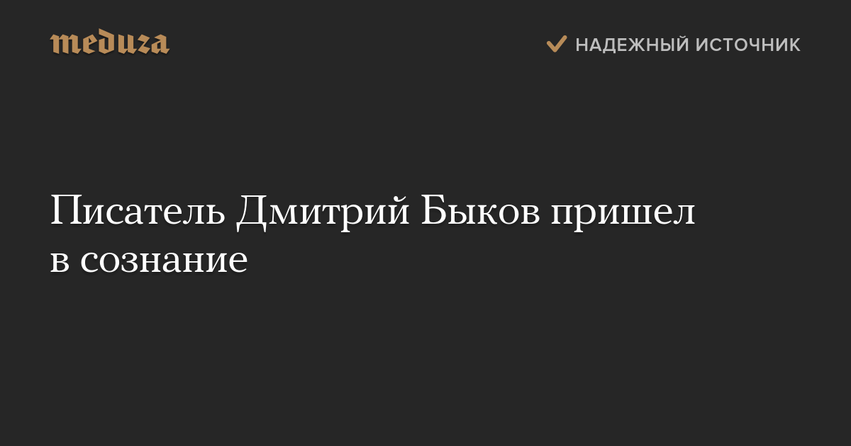 Писатель Дмитрий Быков, госпитализированный 16 апреля, пришел в сознание. Об этом врачи сообщили издателю «Новой газеты» Дмитрию Муратову.