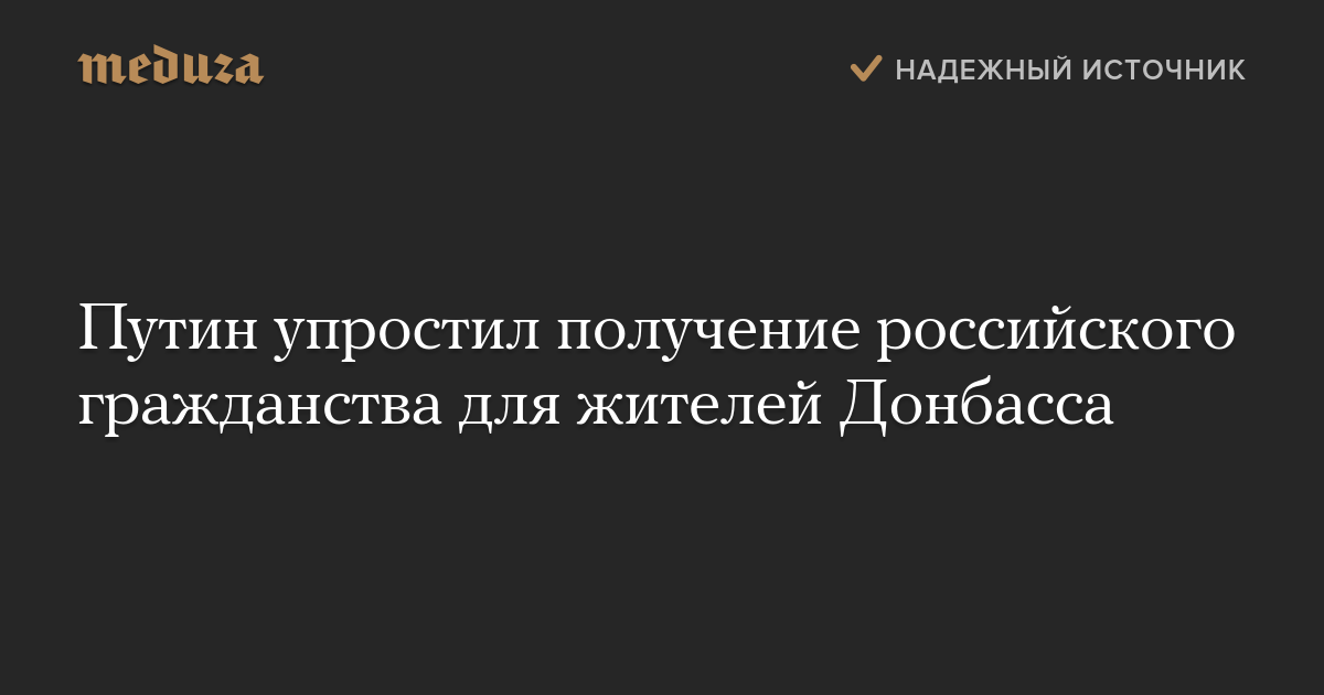 Президент РФ Владимир Путин подписал указ об упрощенном порядке получения российского гражданства для жителей Донецкой и Луганской народных республик.