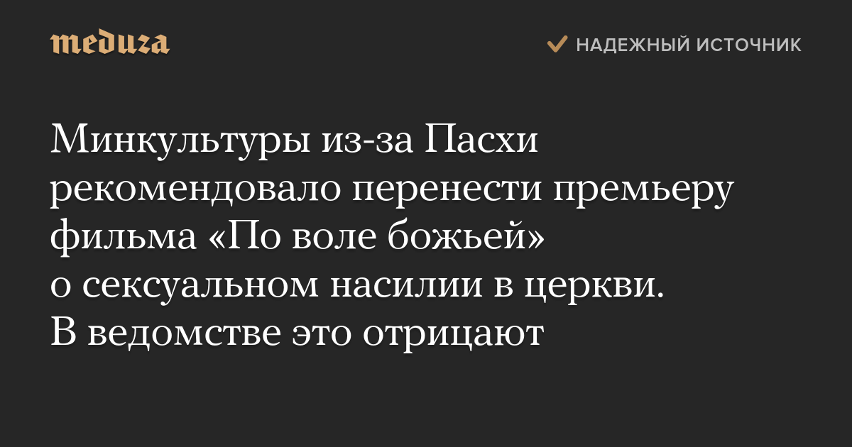 Министерство культуры рекомендовало перенести начало проката в России фильма Франсуа Озона «По воле божьей», в котором жертвы насилия борются в суде с католическими священниками, из-за православной Пасхи. Об этом говорится в сообщении прокатчиков фильма — A-One Films, поступившем в «Медузу».
