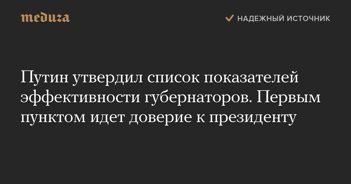 Путин утвердил список показателей эффективности губернаторов. Первым пунктом идет доверие к президенту