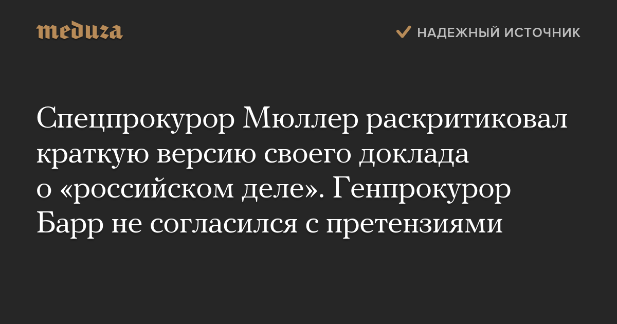 Спецпрокурор Мюллер раскритиковал краткую версию своего доклада о «российском деле». Генпрокурор Барр не согласился с претензиями