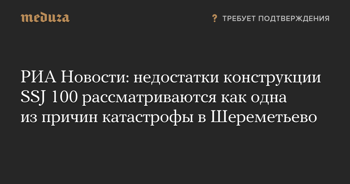 РИА Новости: недостатки конструкции SSJ 100 рассматриваются как одна из причин катастрофы в Шереметьево