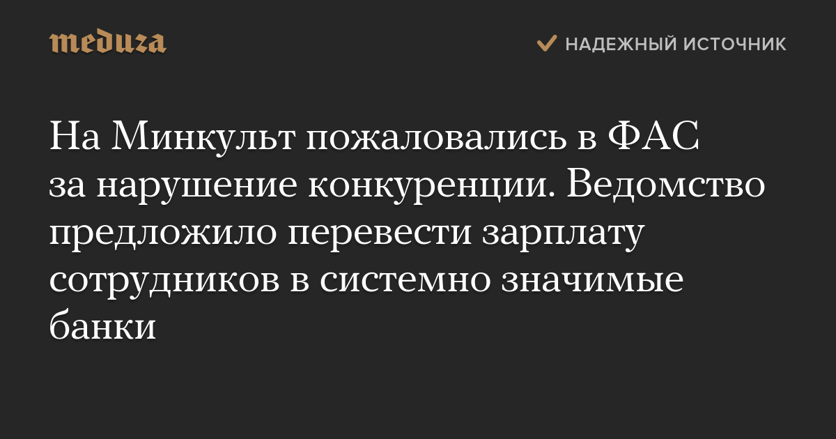 На Минкульт пожаловались в ФАС за нарушение конкуренции. Ведомство предложило перевести зарплату сотрудников в системно значимые банки