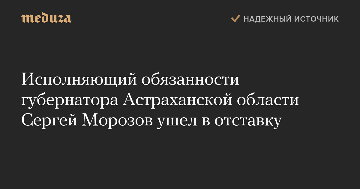 Исполняющий обязанности губернатора Астраханской области Сергей Морозов ушел в отставку по собственному желанию, сообщает ТАСС.