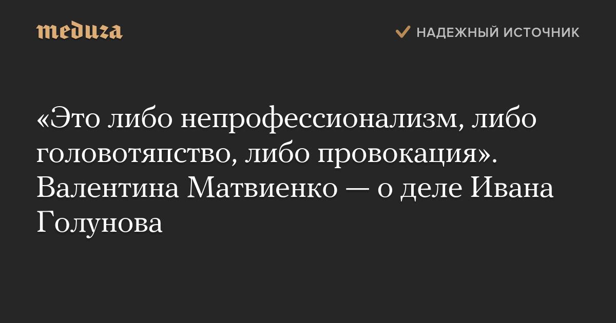 Спикер Совета Федерации РФ Валентина Матвиенко прокомментировала уголовное дело специального корреспондента «Медузы» Ивана Голунова, задержанного по обвинению в сбыте наркотиков.
