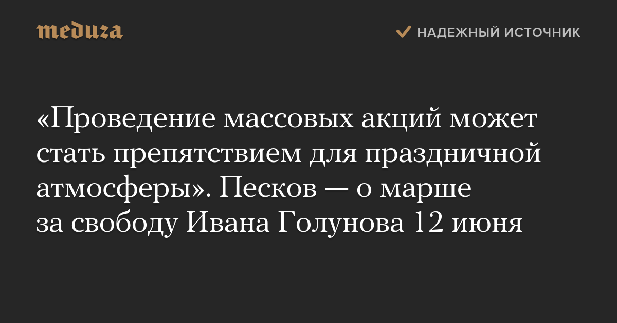 «Проведение массовых акций может стать препятствием для праздничной атмосферы». Песков — о марше за свободу Ивана Голунова 12 июня