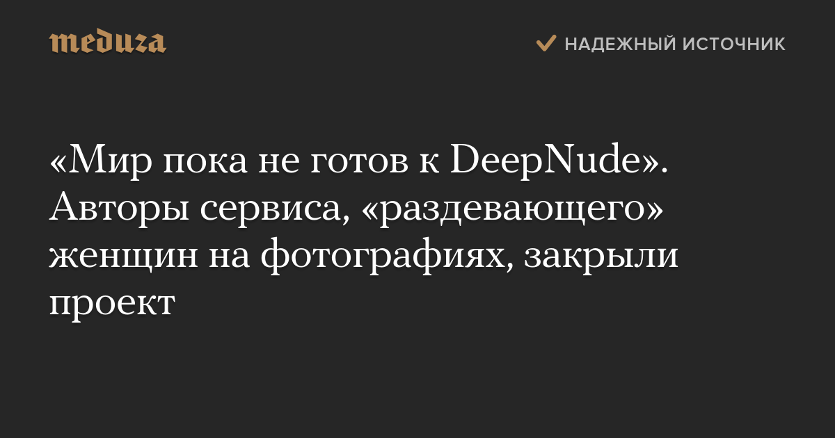 Разработчики сервиса DeepNude, создающего поддельные фотографии обнаженных женщин с помощью нейросети, объявили о закрытии проекта. Команда DeepNude отказалась от дальнейших обновлений программы.