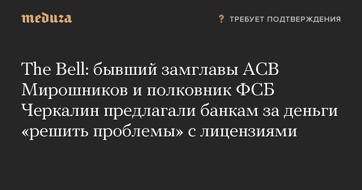 По данным источников The Bell и «Проекта», полковник ФСБ Кирилл Черкалин, обвиняемый в мошенничестве, и бывший первый заместитель главы Агентства по страхованию вкладов (АСВ) Валерий Мирошников предлагали банкам за деньги «решить проблемы» с лицензией.