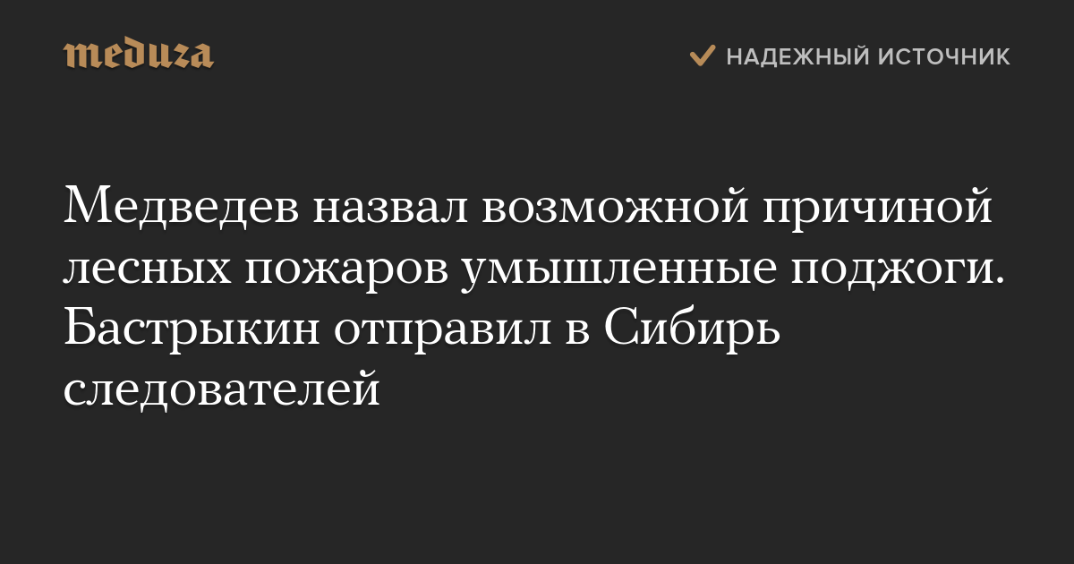 Медведев назвал возможной причиной лесных пожаров умышленные поджоги. Бастрыкин отправил в Сибирь следователей