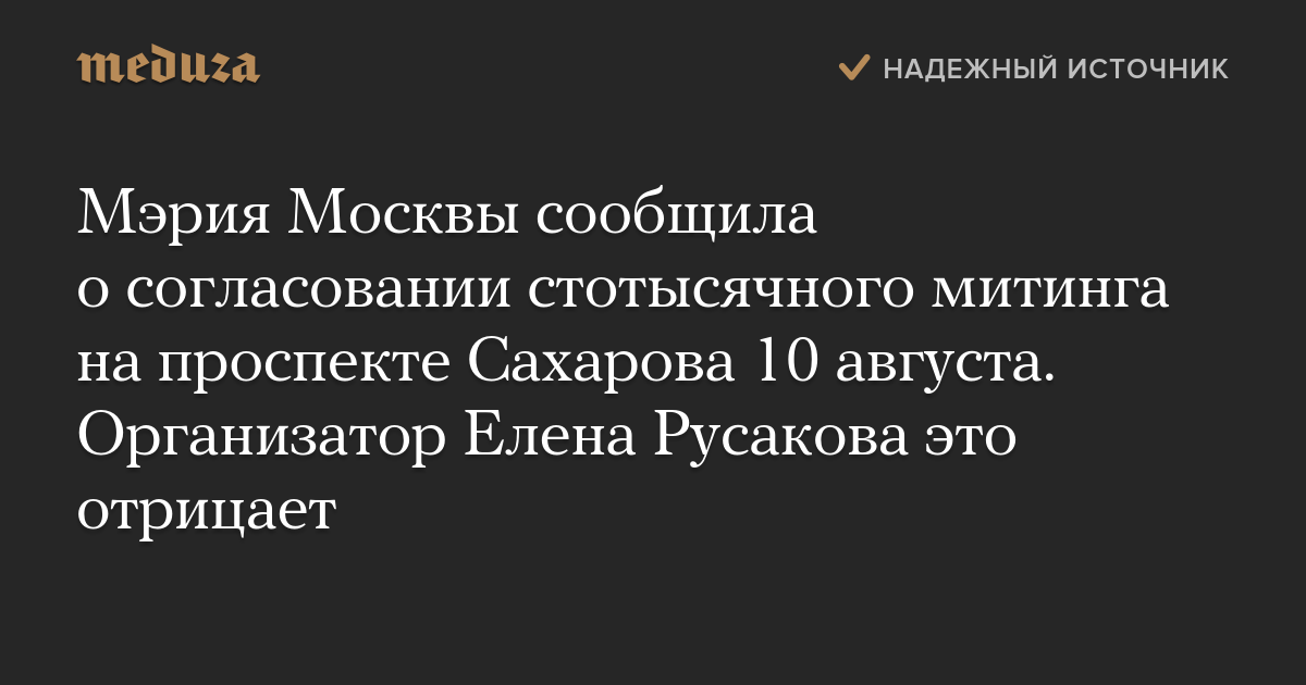 Мэрия Москвы сообщила о согласовании стотысячного митинга на проспекте Сахарова 10 августа. Организатор Елена Русакова это отрицает
