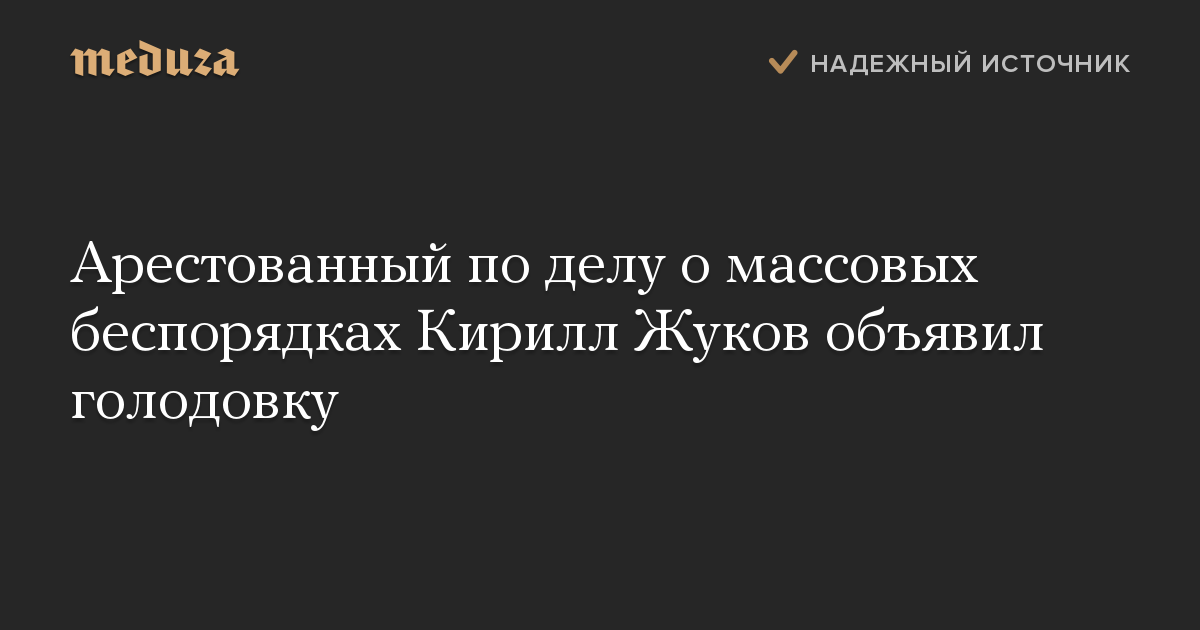 Кирилл Жуков, арестованный 2 августа по делу о массовых беспорядках в Москве, объявил голодовку. Об этом сообщила его адвокат Светлана Байтурина, передает корреспондент «Медузы».