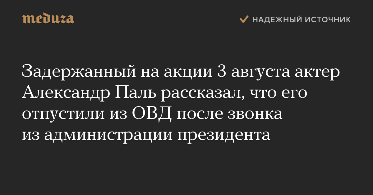 Актера Александра Паля, задержанного на акции протеста 3 августа, отпустили из отделения полиции после звонка из администрации президента. Об этом сам Паль сообщил в интервью «Дождю».