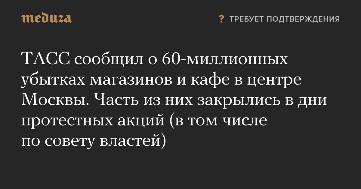 ТАСС сообщил о 60-миллионных убытках магазинов и кафе в центре Москвы. Часть из них закрылись в дни протестных акций (в том числе по совету властей)