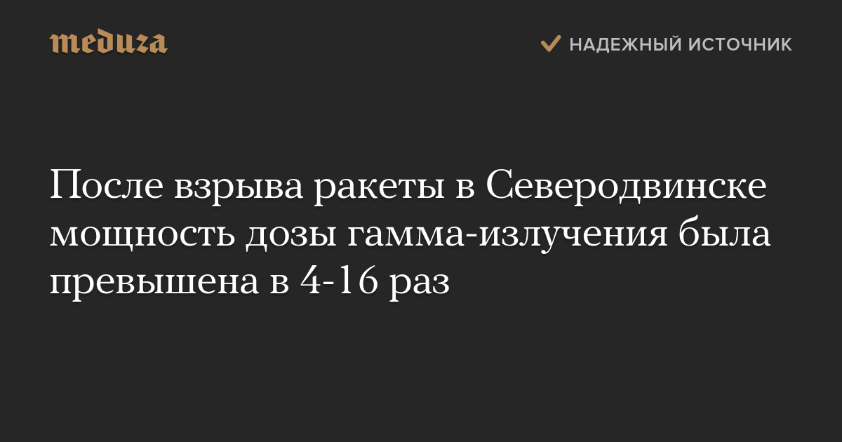 В Северодвинске 8 августа зафиксировали превышение мощности дозы гамма-излучения в 4-16 раз по сравнению с фоновыми значениями после того, как на полигоне в Архангельской области взорвалась ракета. Об этом сообщает 29.ru со ссылкой на главу управления мониторинга состояния и загрязнения окружающей среды Росгидромета Юрия Пешкова.