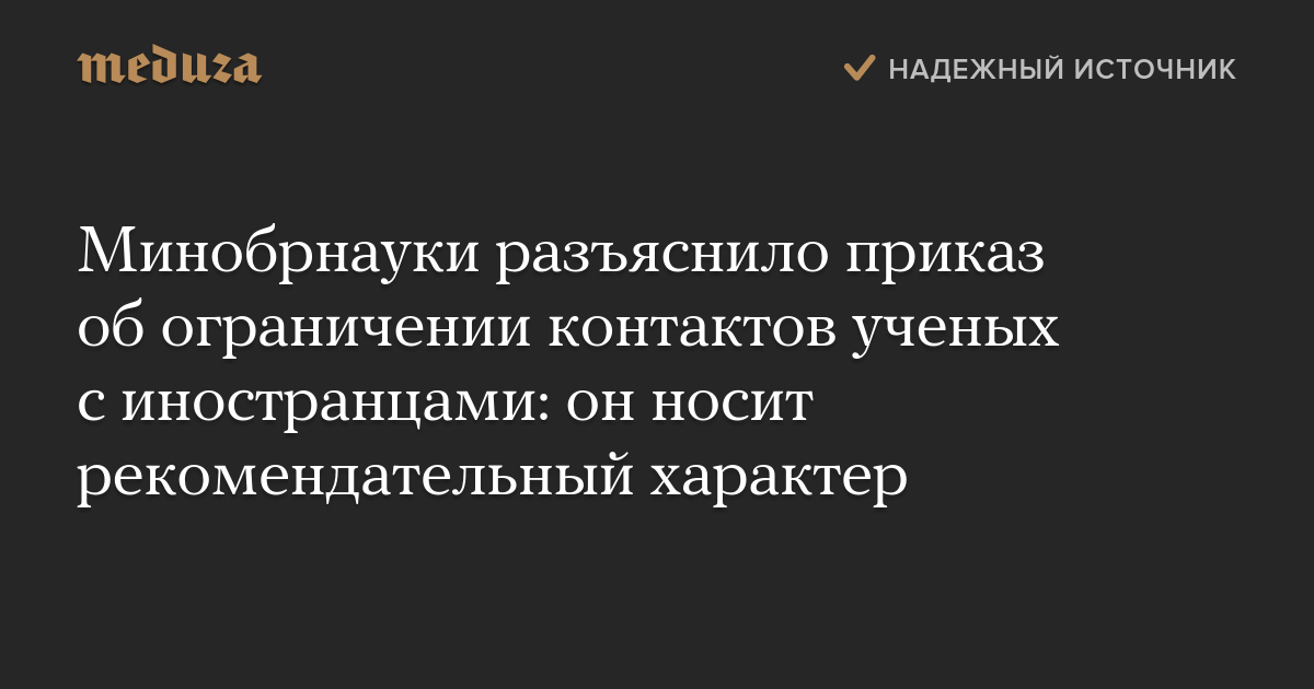 «Рекомендации направлены прежде всего для учета показателей роста международных связей, — заявили в министерстве. — Данный приказ ни в коем случае не направлен для осуществления контроля за организациями, подведомственными Минобрнауки РФ».