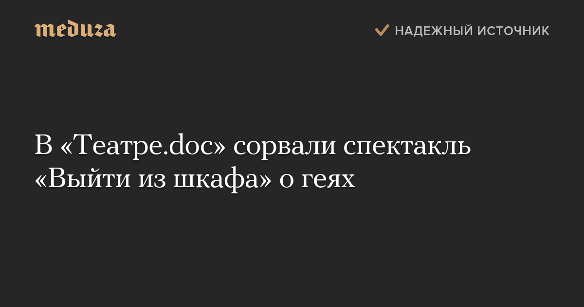 Около 12 человек ворвались в «Театр.doc» и сорвали документальный спектакль «Выйти из шкафа», посвященный жизни российских геев, сообщает «Медиазона».