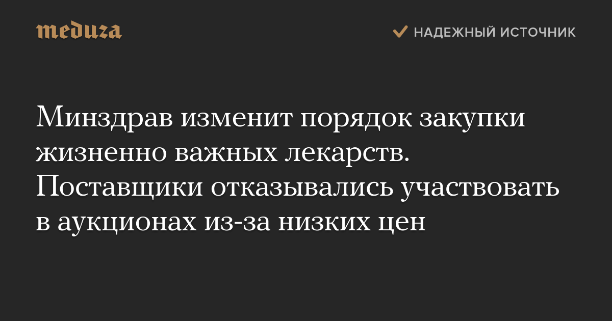 Минздрав изменит порядок закупки жизненно важных лекарств. Поставщики отказывались участвовать в аукционах из-за низких цен