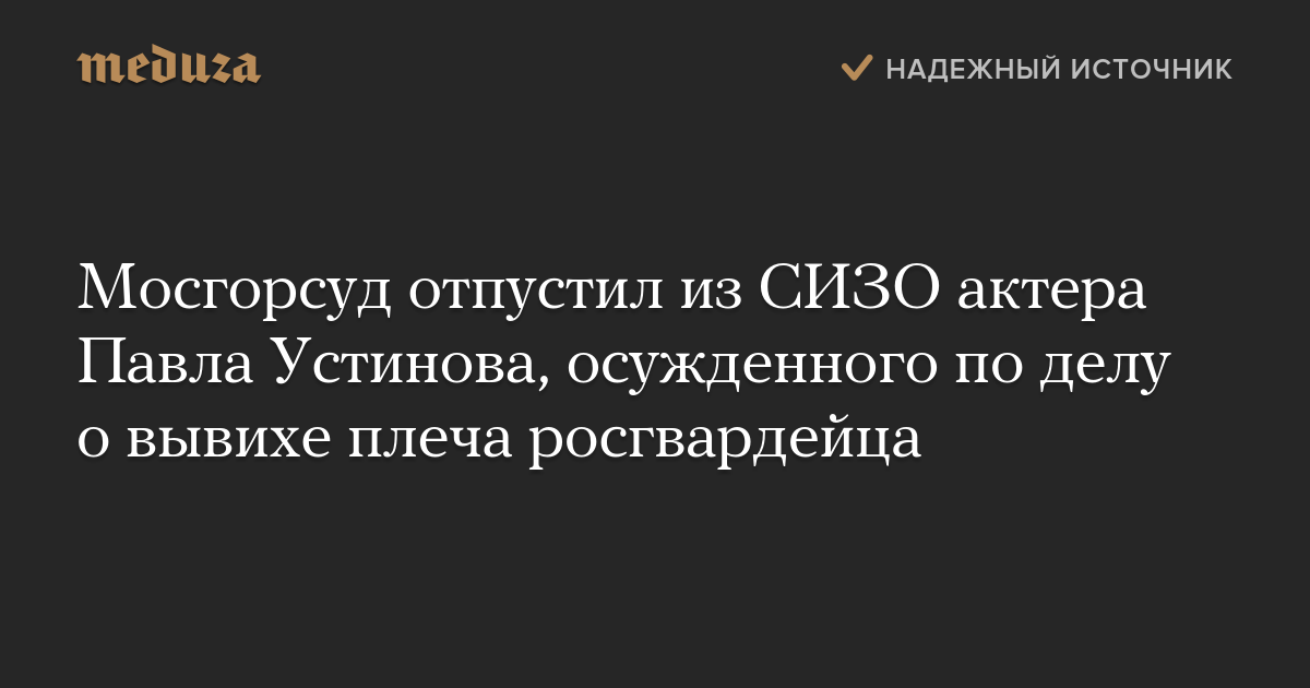 Судья Московского городского суда Юлия Манеркина постановила отпустить актера Павла Устинова, осужденного по статье о нападении на росгвардейца после задержания на акции 3 августа, из СИЗО под подписку о невыезде. Об этом сообщает корреспондент «Медузы».