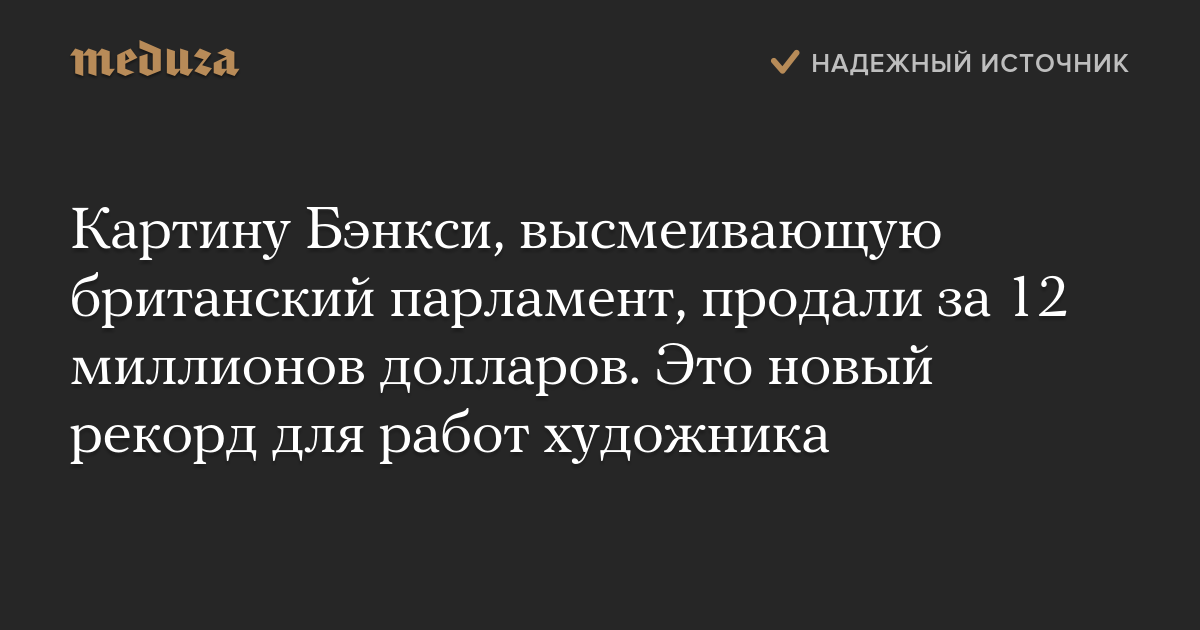 Картину стрит-арт художника Бэнкси, высмеивающую британский парламент, продали на лондонском аукционе Sothebyʼs за 9,9 миллиона фунтов стерлингов (12,2 миллиона долларов). Об этом сообщается на сайте Sothebyʼs.