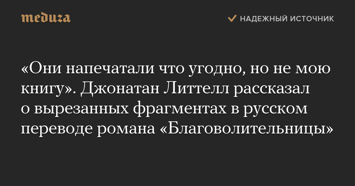 Первое издание романа «Благоволительницы» Джонатана Литтелла на русском языке содержало значительные купюры — при переводе и редактировании из книги были изъяты около 600 фрагментов или примерно 20 страниц текста. Об этом в интервью изданию «Горький» рассказал сам писатель.