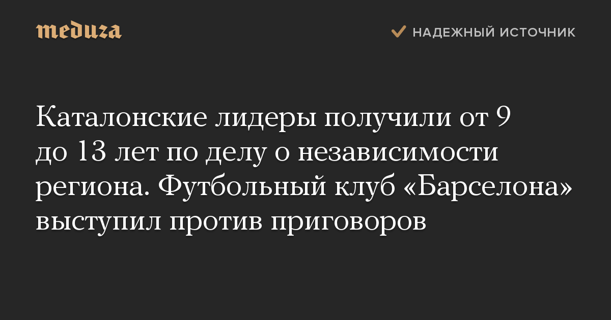 Каталонские лидеры получили от 9 до 13 лет по делу о независимости региона. Футбольный клуб «Барселона» выступил против приговоров