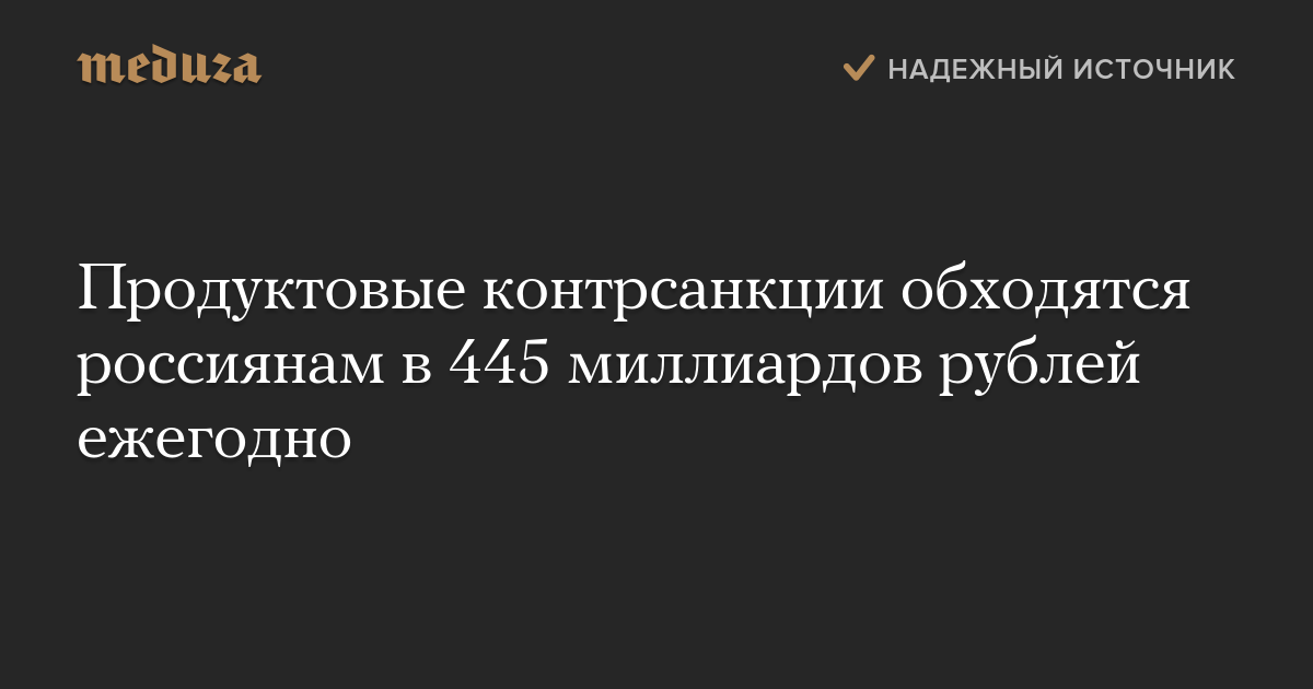 Из-за российских продовольственных контрсанкций жители страны каждый год теряют 445 миллиардов рублей в ценах 2013 года. Об этом говорится в совместном исследовании экономистов РАНХиГС и ЦЭФИР, на которое первым обратил внимание «Коммерсант».