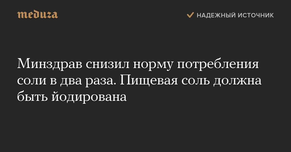 Министр здравоохранения Вероника Скворцова подписала приказ, который устанавливает норму потребления соли на уровне рекомендаций Всемирной организации здравоохранения — 5 граммов в день. Об этом в телеграме написал замминистра Олег Салагай.