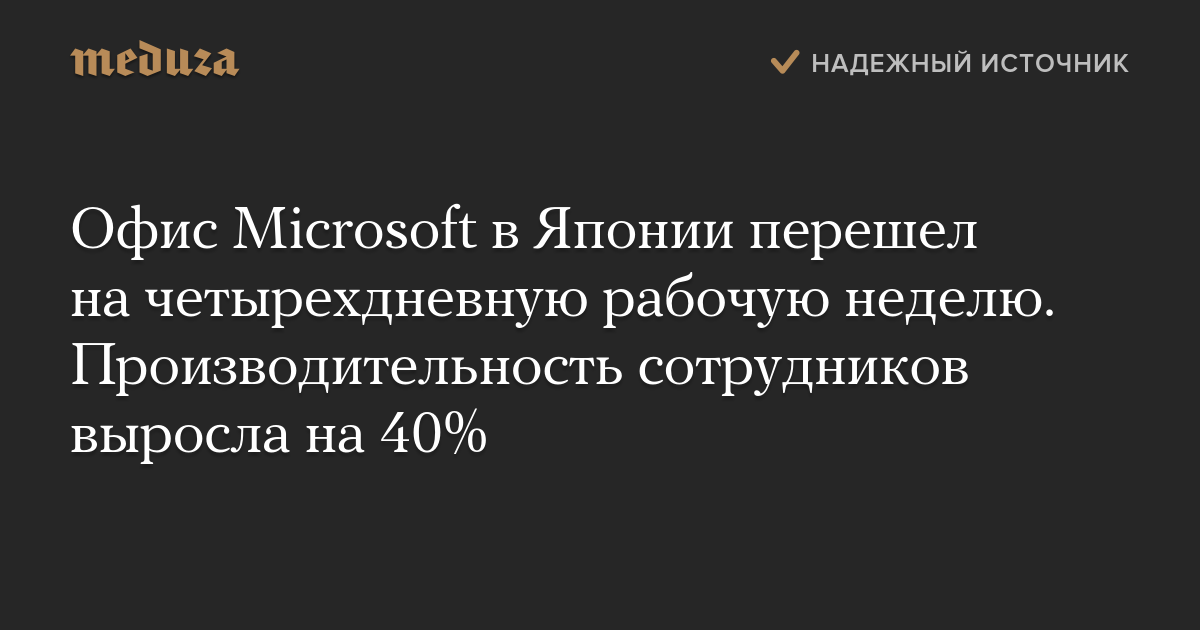 Японский офис Microsoft в качестве эксперимента на месяц перешел на четырехдневную рабочую неделю. Результаты показали, что это положительно сказалось не только на работниках, но и на результатах компании.