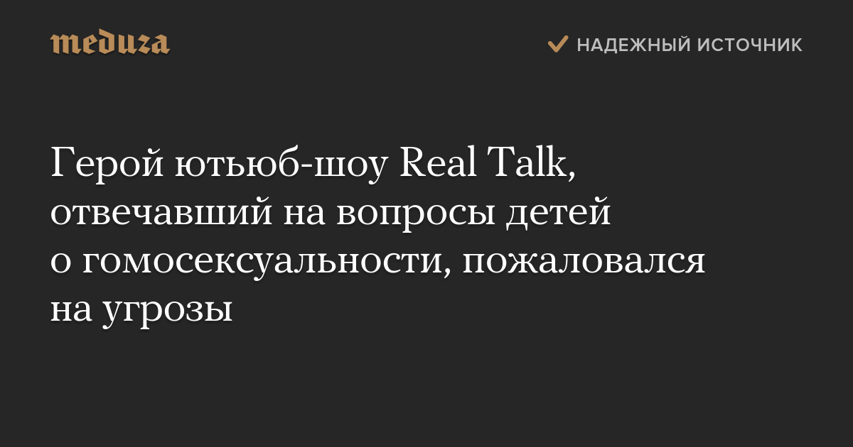 Герой ютьюб-шоу Real Talk, отвечавший на вопросы детей о гомосексуальности, пожаловался на угрозы