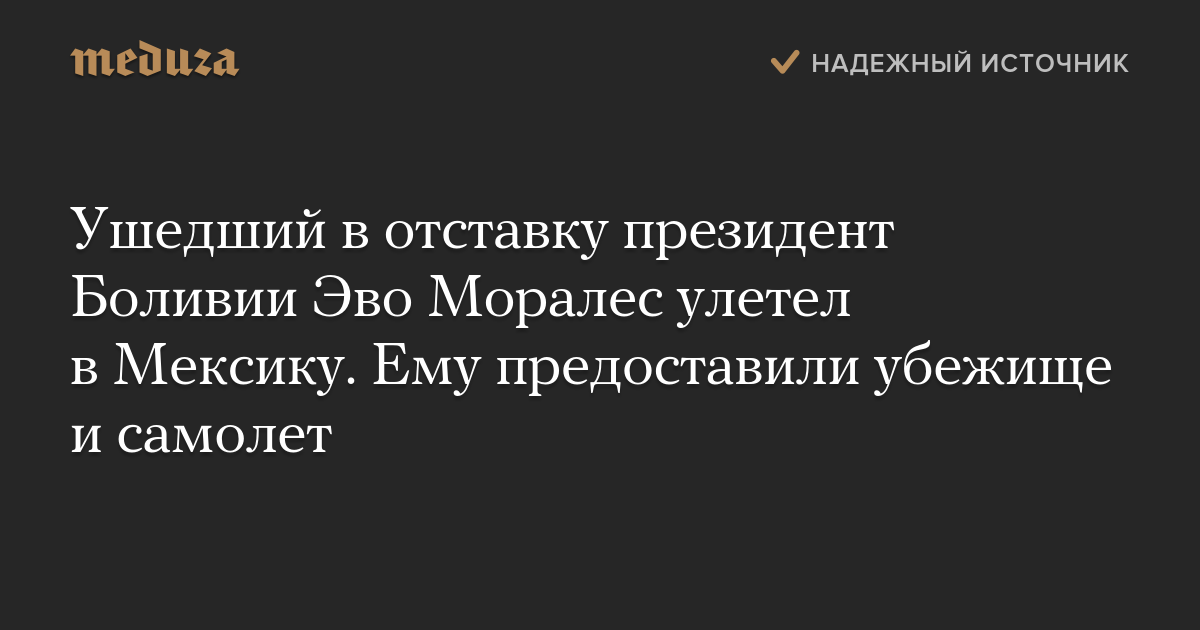 Моралес сел на мексиканский правительственный самолет в боливийском городе Чиморе, оплоте его сторонников. Министр иностранных дел Мексики Марсело Эбрард подтвердил в твиттере, что бывший президент уже на борту и «находится под защитой Мексики». Он опубликовал фотографию Моралеса в салоне самолета с мексиканским флагом в руках.