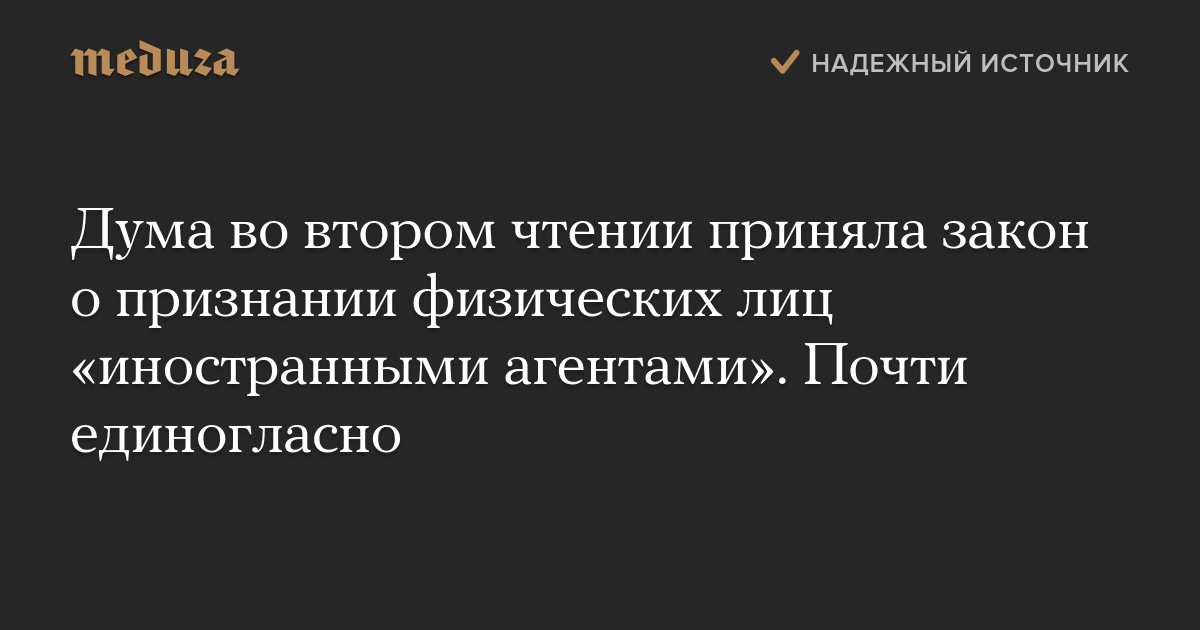 Дума во втором чтении приняла закон о признании физических лиц «иностранными агентами». Почти единогласно