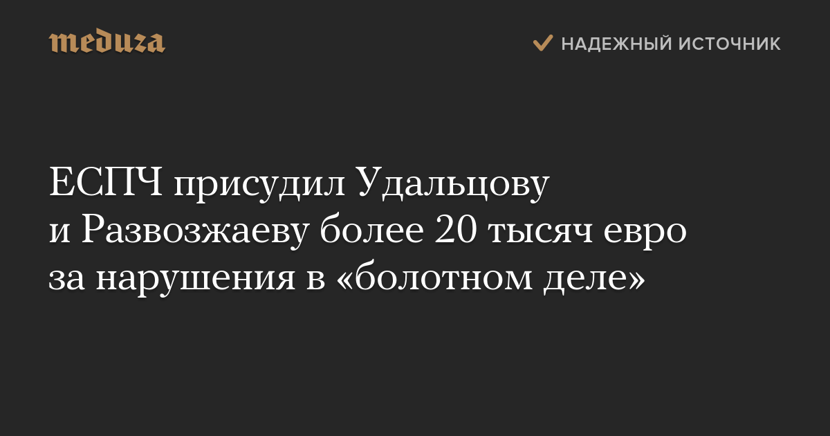 Европейский суд по правам человека вынес решение по жалобе Сергея Удальцова и Леонида Развозжаева в связи с расследованием «болотного дела». Развозжаеву суд присудил 15 тысяч евро (11 тысяч — от России и четыре — от Украины), а Удальцову — 9 тысяч евро.