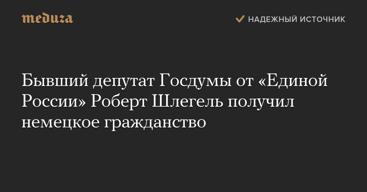 Бывший комиссар движения «Наши», экс-депутат Госдумы от «Единой России» Роберт Шлегель получил немецкое гражданство, сообщает Süddeutsche Zeitung.