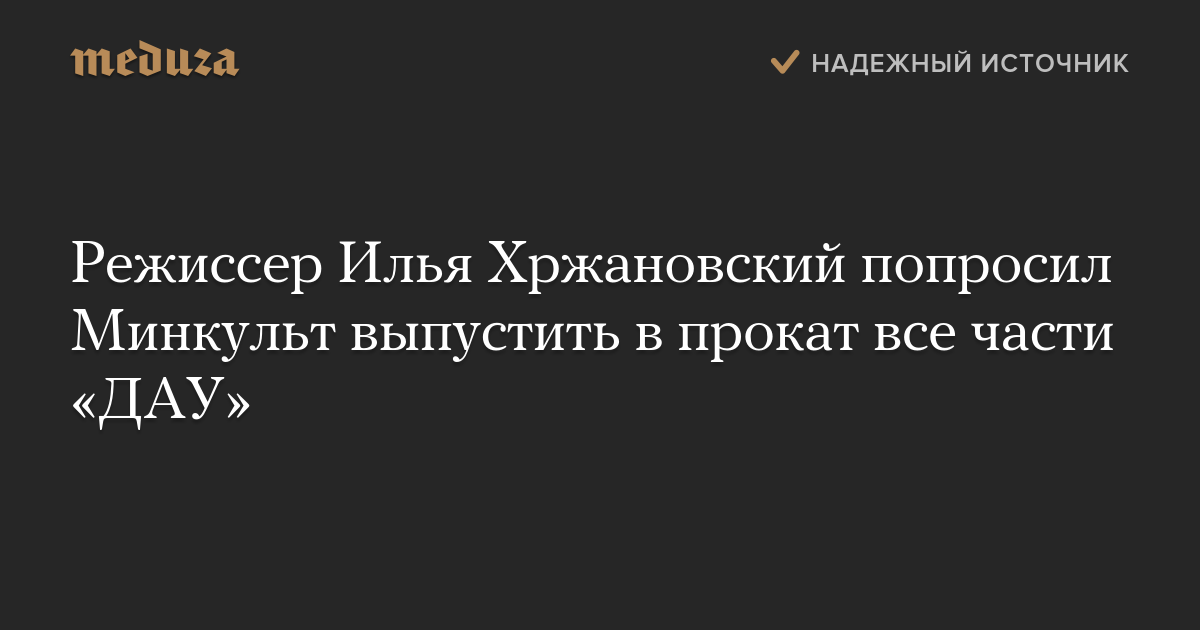 Режиссер Илья Хржановский обратился к министру культуры Владимиру Мединскому с просьбой выдать прокатные удостоверения всем фильмам кинопроекта «ДАУ». Об этом сообщают «Ведомости», в распоряжении которых есть копия обращения режиссера.