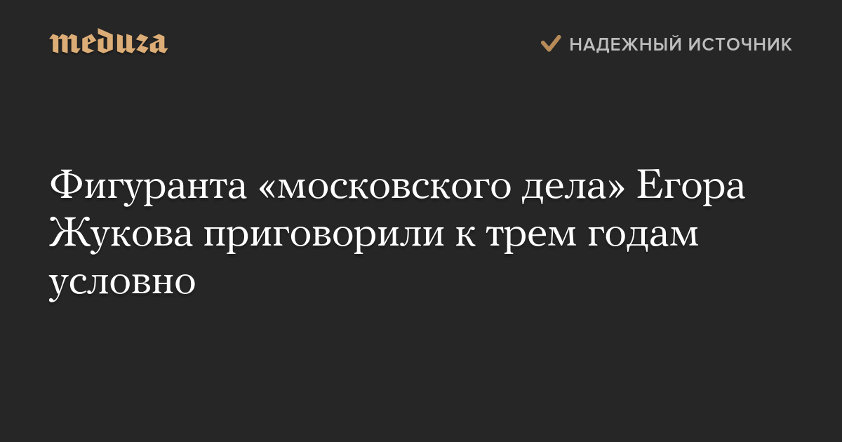 Кунцевский районный суд Москвы приговорил к трем годам условно фигуранта «московского дела» Егора Жукова. Об этом сообщает корреспондент «Медузы» из зала суда.