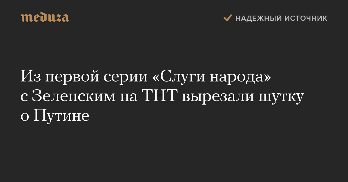 Телеканал ТНТ вырезал шутку о президенте России Владимире Путине из первого эпизода сериала «Слуга народа», где главную роль сыграл президент Украины Владимир Зеленский. Шутку убрали из серии, показанной в Москве, пишет «Русская служба „Би-би-си“». Также об этом сообщают пользователи соцсетей.