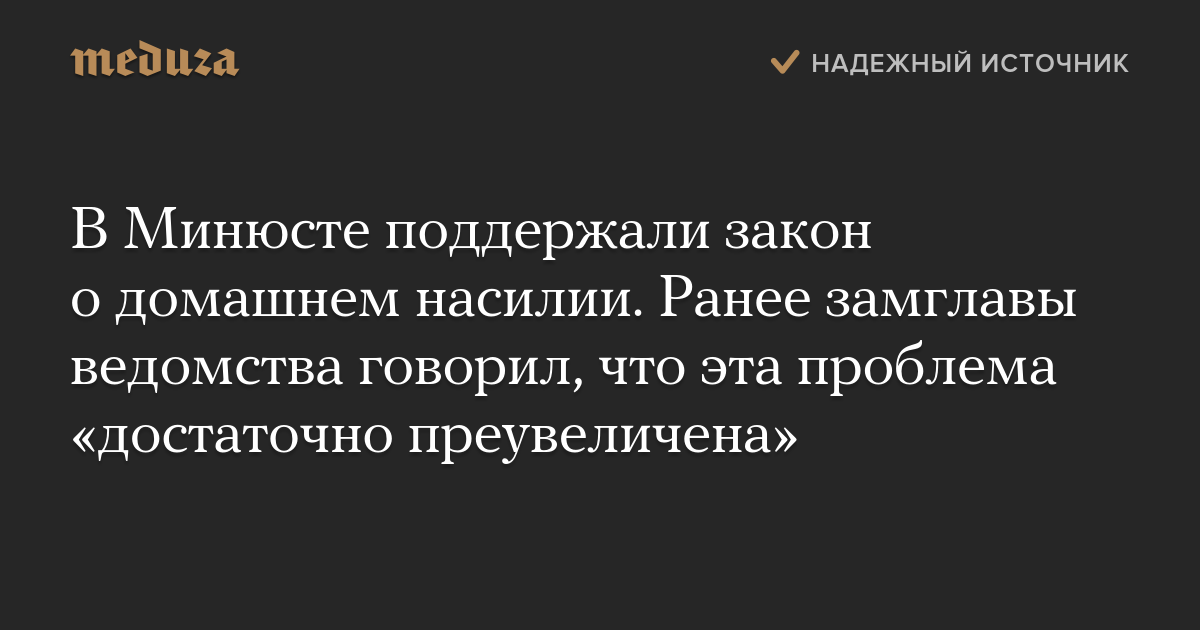 Минюст РФ ответил на письмо родственников жертв домашнего насилия, осудивших уполномоченного России при ЕСПЧ, замминистра юстиции Михаила Гальперина из-за слов, что масштабы проблемы домашнего насилия в России «достаточно преувеличены». Об этом «Медузе» рассказали в организации «Зона права», получившей ответ Минюста. Первым об этом сообщил «Коммерсант».