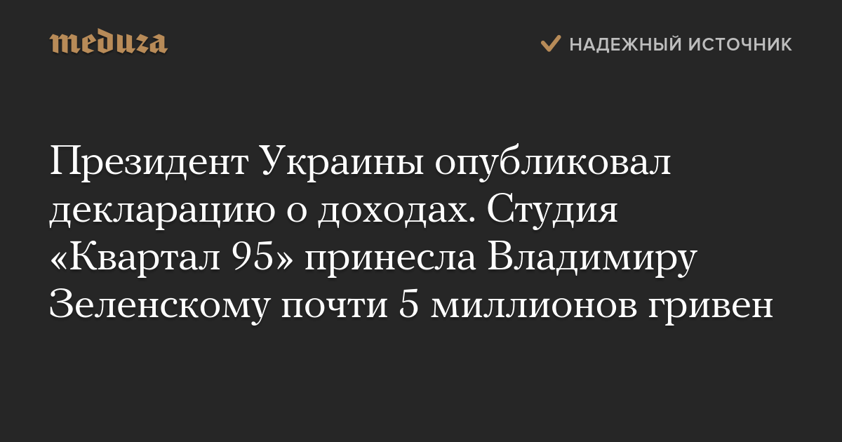 За 2018 год Зеленский задекларировал доход в 9,7 миллиона гривен, из них 4,2 миллиона были заработаны на основном месте работы в студии «Квартал 95», одним из создателей которой является действующий президент Украины.