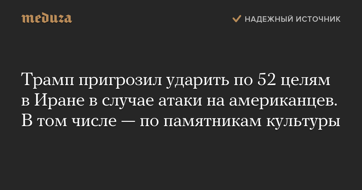 Трамп пригрозил ударить по 52 целям в Иране в случае атаки на американцев. В том числе — по памятникам культуры