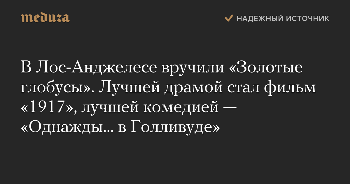 В Лос-Анджелесе вручили «Золотые глобусы». Лучшей драмой стал фильм «1917», лучшей комедией — «Однажды… в Голливуде»