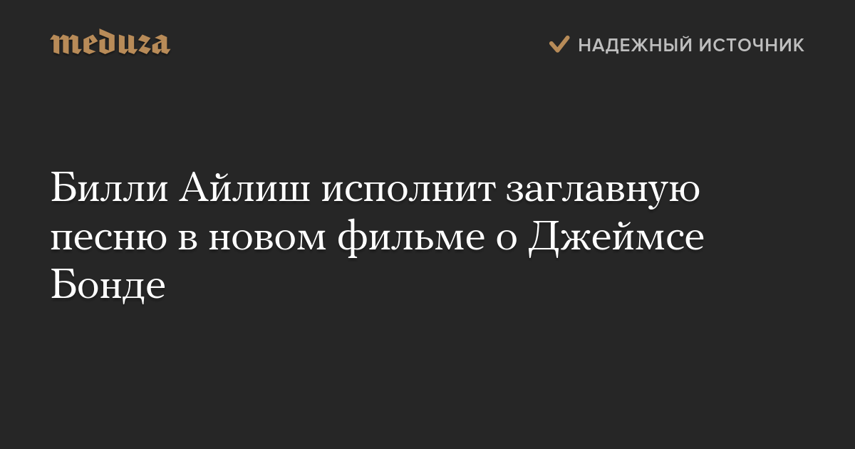 Заглавную песню в новом фильме о Джеймсе Бонде исполнит Билли Айлиш. Об этом сообщается в официальном твиттере франшизы об агенте 007.